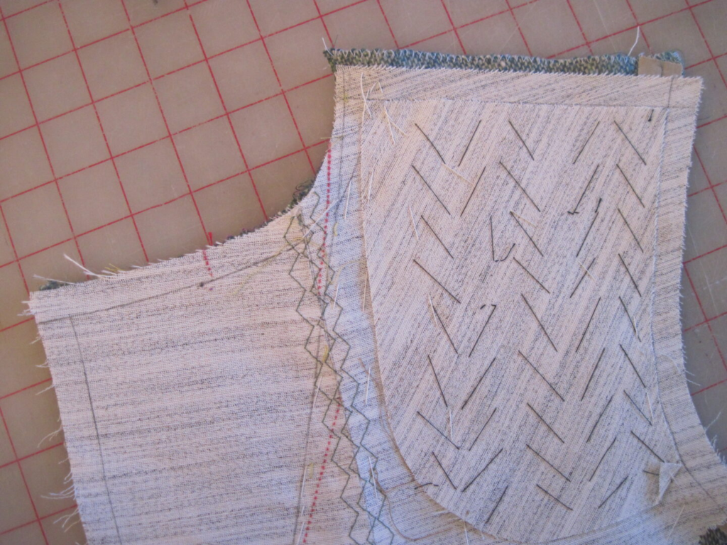 Kenneth showed how to baste a long line from hem to shoulder point to anchor the canvas vertically. Then he flipped back the front enough to catchstitch the bags of his welt pockets to the canvas. Then he basted horizontally at the waistline. He followed with vertical lines of basting starting at the waist down to the hem and up to the shoulder point. He finished with lines of basting to hold the canvas at the armhole and along the pinked edge. This probably took more time to explain than to do.