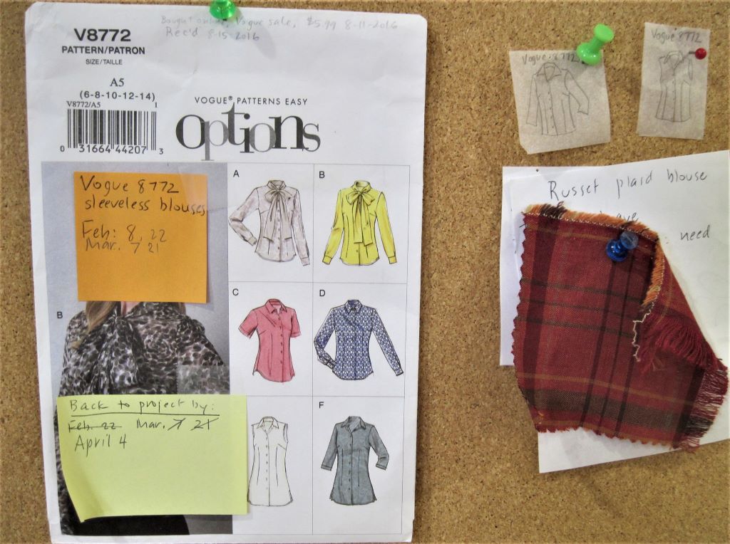 I have two main tools that are reminders of my project every time I’m in the sewing room:  the bulletin board and the clipboard.