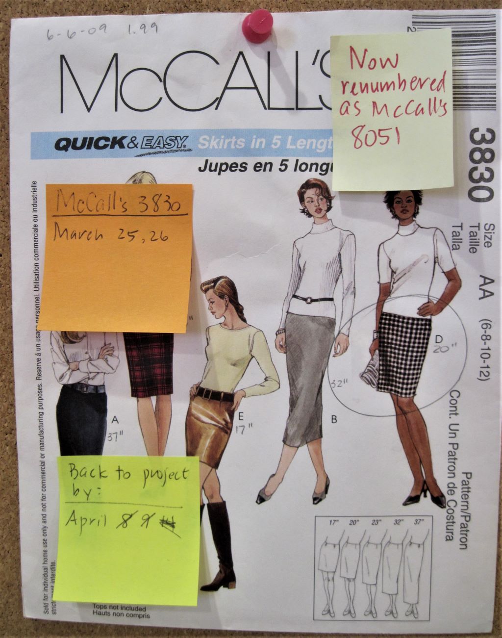 At a glance I can see the past (when I worked on that pattern) and the future (the date by which I’m expected to return).  These Post-Its remind me: