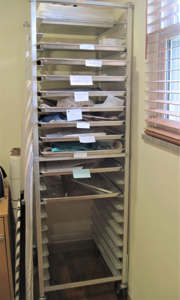 Each project is stored on a full-size, commercial sheet pan that is easy to pull out and return to my rolling baker’s rack.