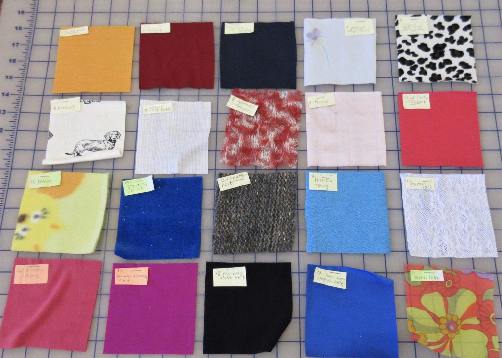 It was fun to lay out all the swatches and attach their identification numbers and descriptions (#1, double knit; #12, stretch velvet, etc.) to them.