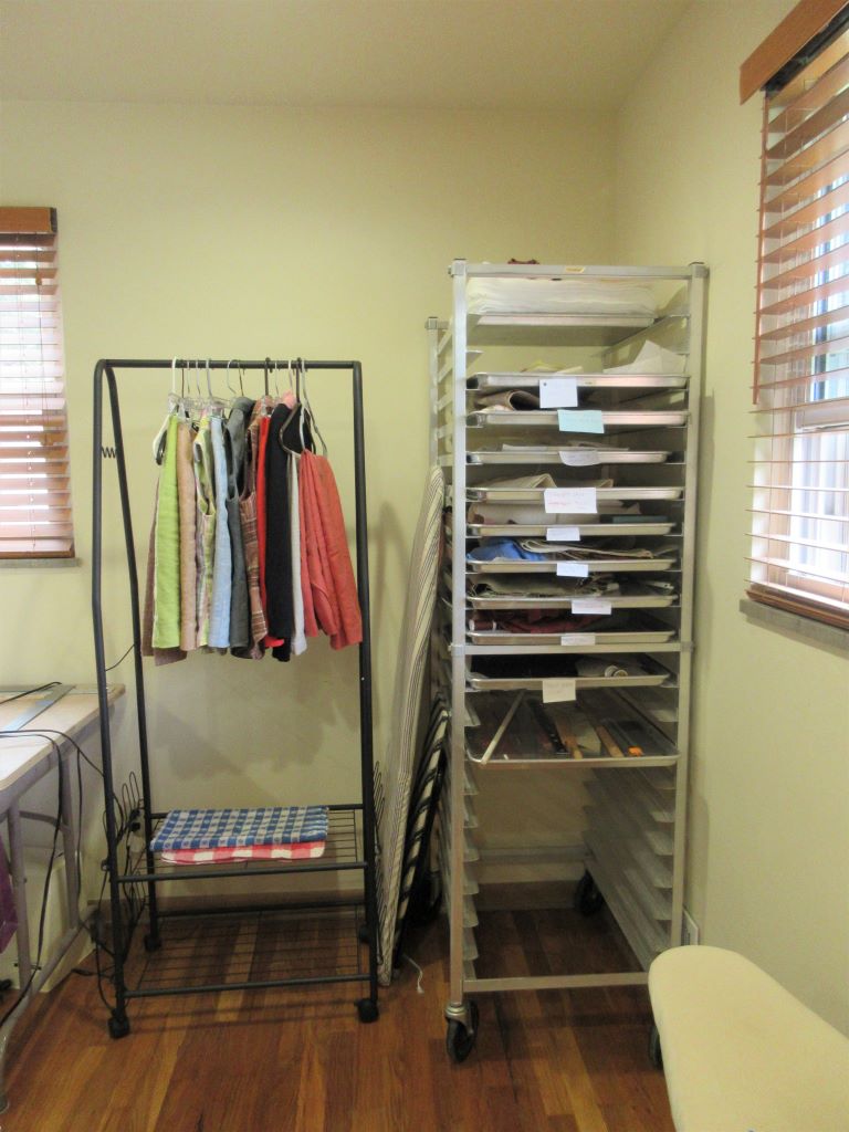 After: Ironing and mending are now arranged on a rolling clothes rack. The file cart is stowed under a work table. The rack will also be great for planning outfits and capsules.