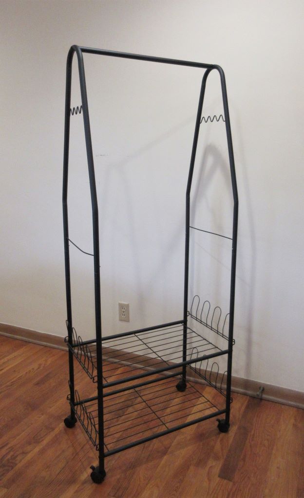 What had stopped me from shopping for a clothes rack before was not having the floor space for it. Then I saw that I could handily stow the file cart under my work tables for the time being. On the Bed, Bath, and Beyond website I found the Whitmor Multi-Functional Garment Rack. Not only did it have a garment rod, it had shelves, holders for eight pairs of shoes, and even “integrated accessory hooks for belts, ties, and scarves.” Great! It was a perfect fit for the space and exceeded my expectations for functionality.