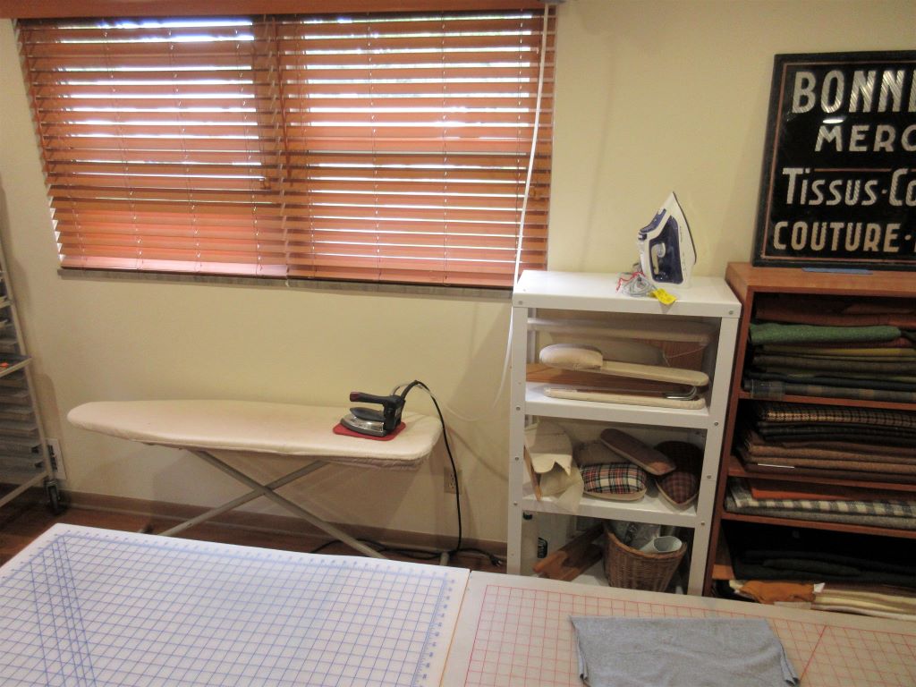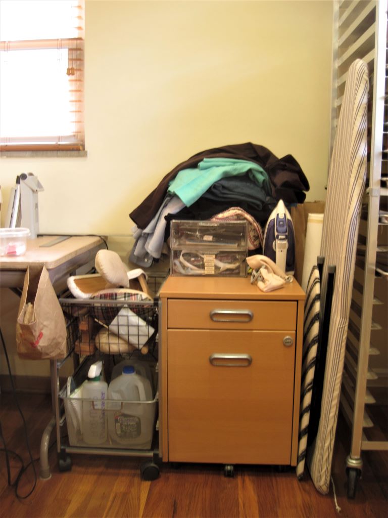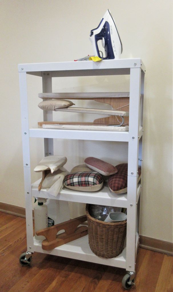 Again, my storage solution was close at hand. Two or three years ago I’d bought this nice-looking set of rolling shelves on clearance to store cleaning supplies in a closet. All I had to do was measure my pressing equipment, the available floor space, and these shelves, and I realized I could make this work. I easily found inexpensive plastic stacking shelves to put back into the closet to hold the cleaning supplies
