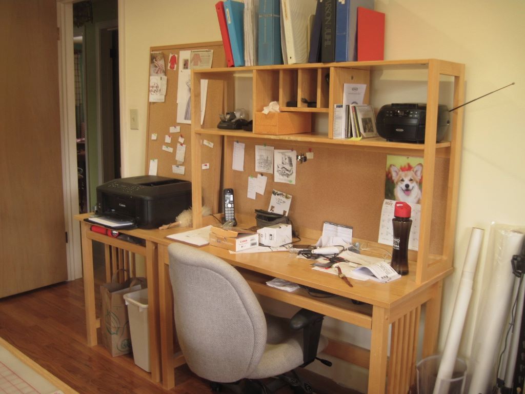 One day I realized this student desk set I’d bought at a garage sale a few years back had stopped earning its keep. It had become a dumping ground for things that had no assigned home and was no longer where I liked to write. The divided storage spaces of the shelf unit and the stand for the printer were unadaptable. Plus, I had two office chairs when all I needed was one.