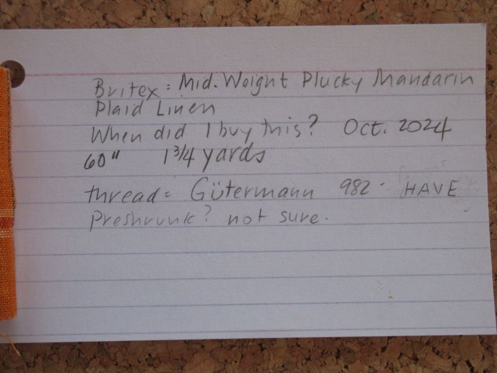 When I preshrink the fabric I’ll note that on the card. When I look for thread color matches I’ll note on the card that I have thread to match or will need to order it. Same goes for zippers and buttons.